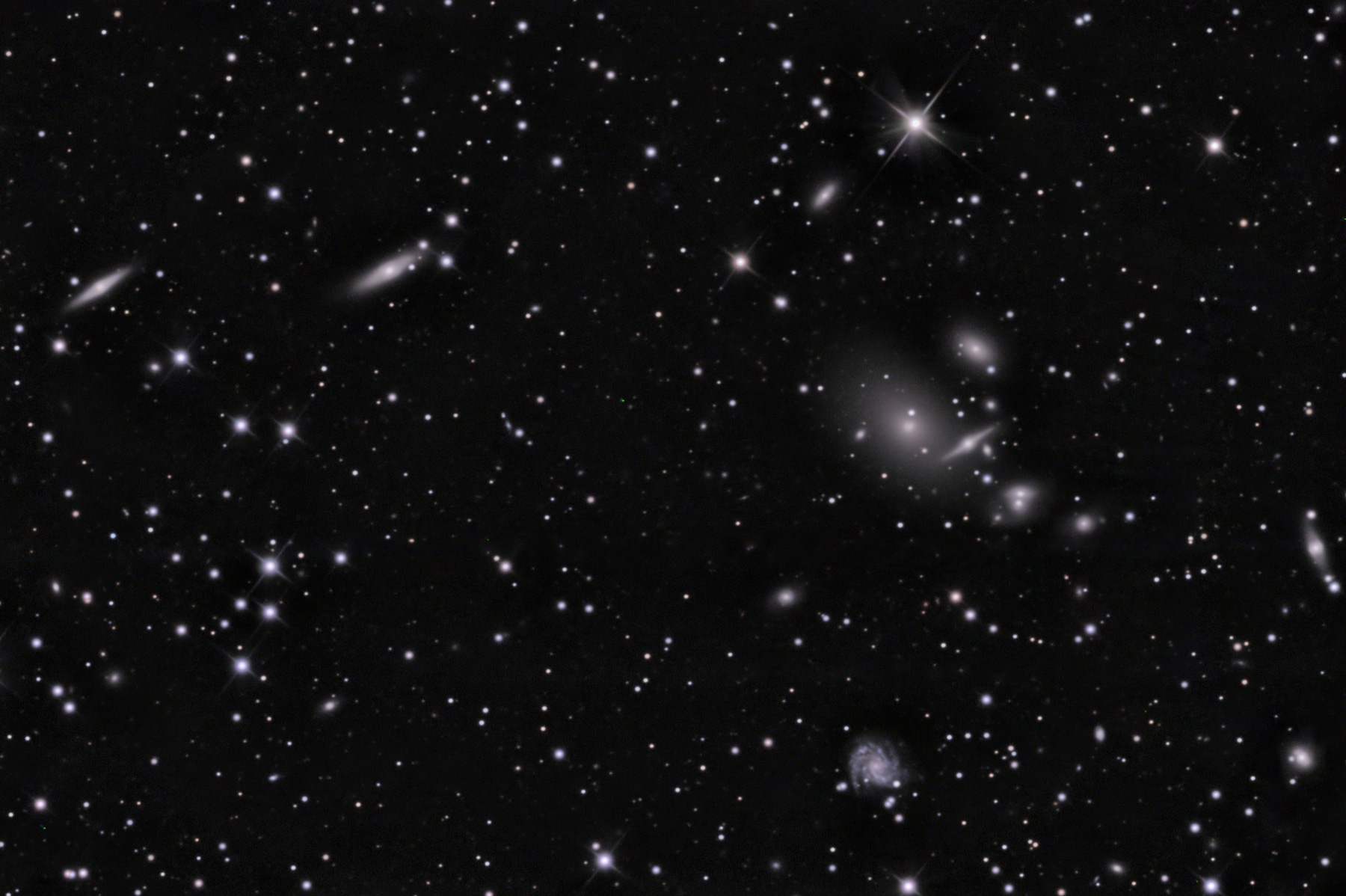 | Abell 262 Galaxy Cluster in Andromeda Abell 262 is a galaxy cluster in Andromeda near the border with Triangulum, and is centered on NGC 708, a cluster dominant elliptical galaxy similar to M87. The cluster is part of the Pisces-Perseus supercluster, approximately 205-250 million light years distant. Recent measurements of red shifts indicate that many of the fainter galaxies in the field of view are in fact more distant objects located in a distant background supercluster. The above field of view is centered at RA: 01h 53m 21s Dec: +36d 10' 4", and covers approximately 15 x 24 arc minutes. Date: December 13-16, 2006; LRGB processed March 1, 2010. Camera: SBIG STL6303E Filters: AstroDon LRGB Camera control software: CCDSoft Guiding/adaptive optics: AO-L, MOAG-A off axis guider Camera temperature: -20C Image Acquisition Software: CCDAP3 Telescope: RCOS 16 Carbon Tube, Aries optics, F9 with Field Flattener Telescope control software: RCOS TCC, TheSky6 Mount: Paramount ME (MKS 4000) Subexposures: Total exposure time: 15 hours Luminance: 52 x 10 minute, binned 1x1 RGB (also used as additional Luminance): 38 x10 minute, binned 2x2 Conditions: Seeing conditions over 4 nights averaged 2.2 arc sec; target elevation from 55 degrees to 89 degrees. FWHM of combined Luminance data: 2.6 arc sec. Processing: CCDInspector, MaximDL, MiraAP, Photoshop CS2. Image appeared in November 2010 issue of Astronomy Magazine. |