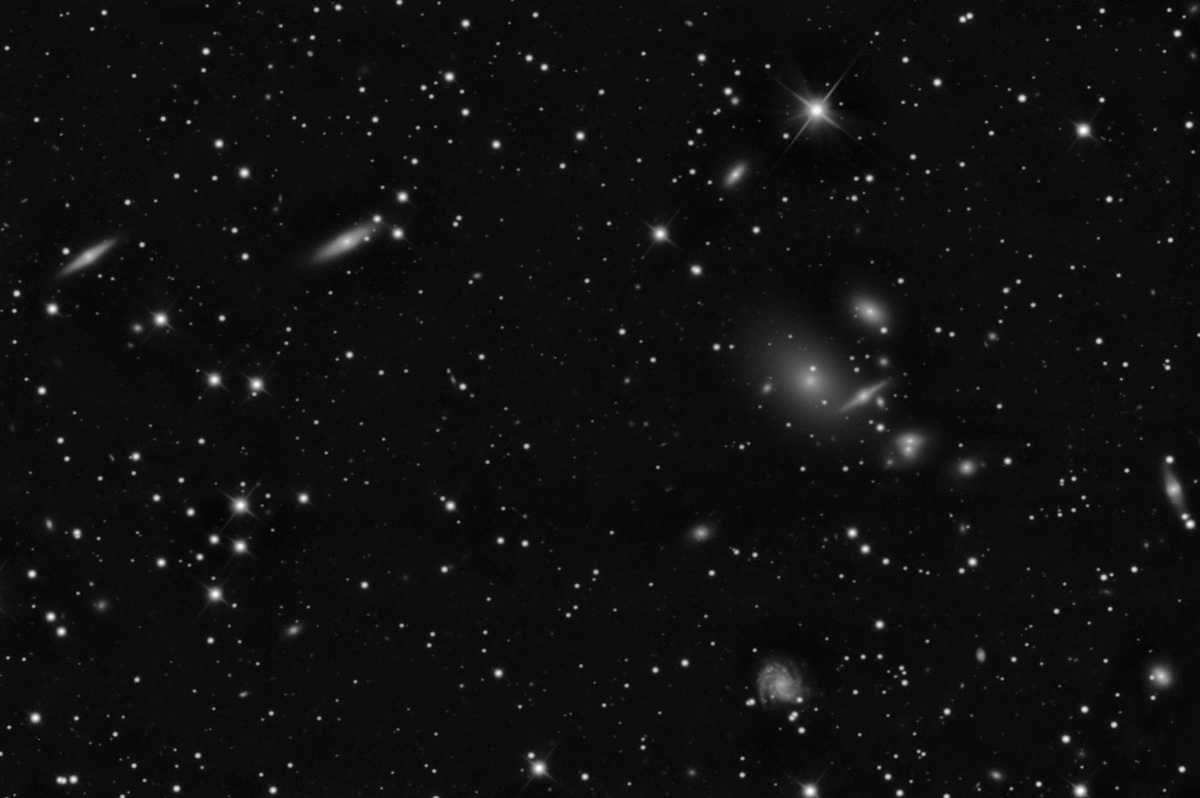 | Abell 262 Galaxy Cluster in Andromeda Abell 262 is a galaxy cluster in Andromeda near the border with Triangulum, and is centered on NGC 708, a cluster dominant elliptical galaxy similar to M87. The cluster is part of the Pisces-Perseus supercluster, approximately 205-250 million light years distant. Recent measurements of red shifts indicate that many of the fainter galaxies in the field of view are in fact more distant objects located in a distant background supercluster. The above field of view is centered at RA: 01h 53m 21s Dec: +36d 10' 4", and covers approximately 15 x 24 arc minutes. Date: December 13-16, 2006; LRGB data processed March 1, 2010. Camera: SBIG STL6303E Filters: AstroDon LRGB Camera control software: CCDSoft Guiding/adaptive optics: AO-L, MOAG-A off axis guider Camera temperature: -20C Image Acquisition Software: CCDAP3 Telescope: RCOS 16 Carbon Tube, Aries optics, F9 with Field Flattener Telescope control software: RCOS TCC, TheSky6 Mount: Paramount ME (MKS 4000) Subexposures: Total exposure time: 15 hours Luminance: 52 x 10 minute, binned 1x1 RGB ( also used as additional Luminance): 38 x10 minute, binned 2x2 Conditions: Seeing conditions over 4 nights averaged 2.2 arc sec; target elevation from 55 degrees to 89 degrees. FWHM of combined Luminance data: 2.6 arc sec. Processing: CCDInspector, MaximDL, MiraAP, Photoshop CS2. Image appeared in November 2010 issue of Astronomy Magazine. |