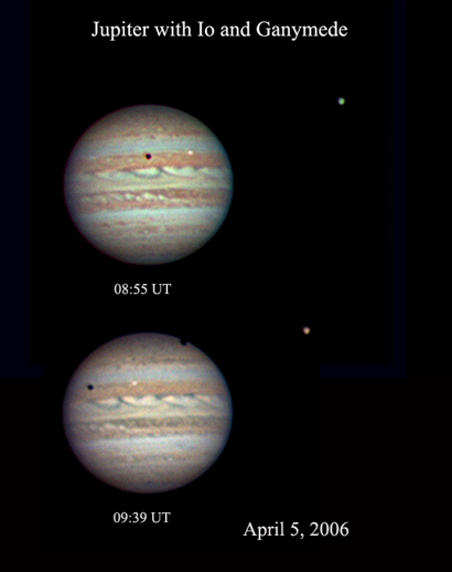 Double Shadow Transit of Io and Ganymede Date: April 5, 2006, 8:55-9:39 UT Camera: Lu075M Filters: AstroDon IR, R, G & B Camera control software: Lucam Recorder Telescope: TEC MC250/20 @ F20 Telescope control software: Pulseguide, TheSky6 Mount: AP1200GTO Processing: Registax, Photoshop CS2. |