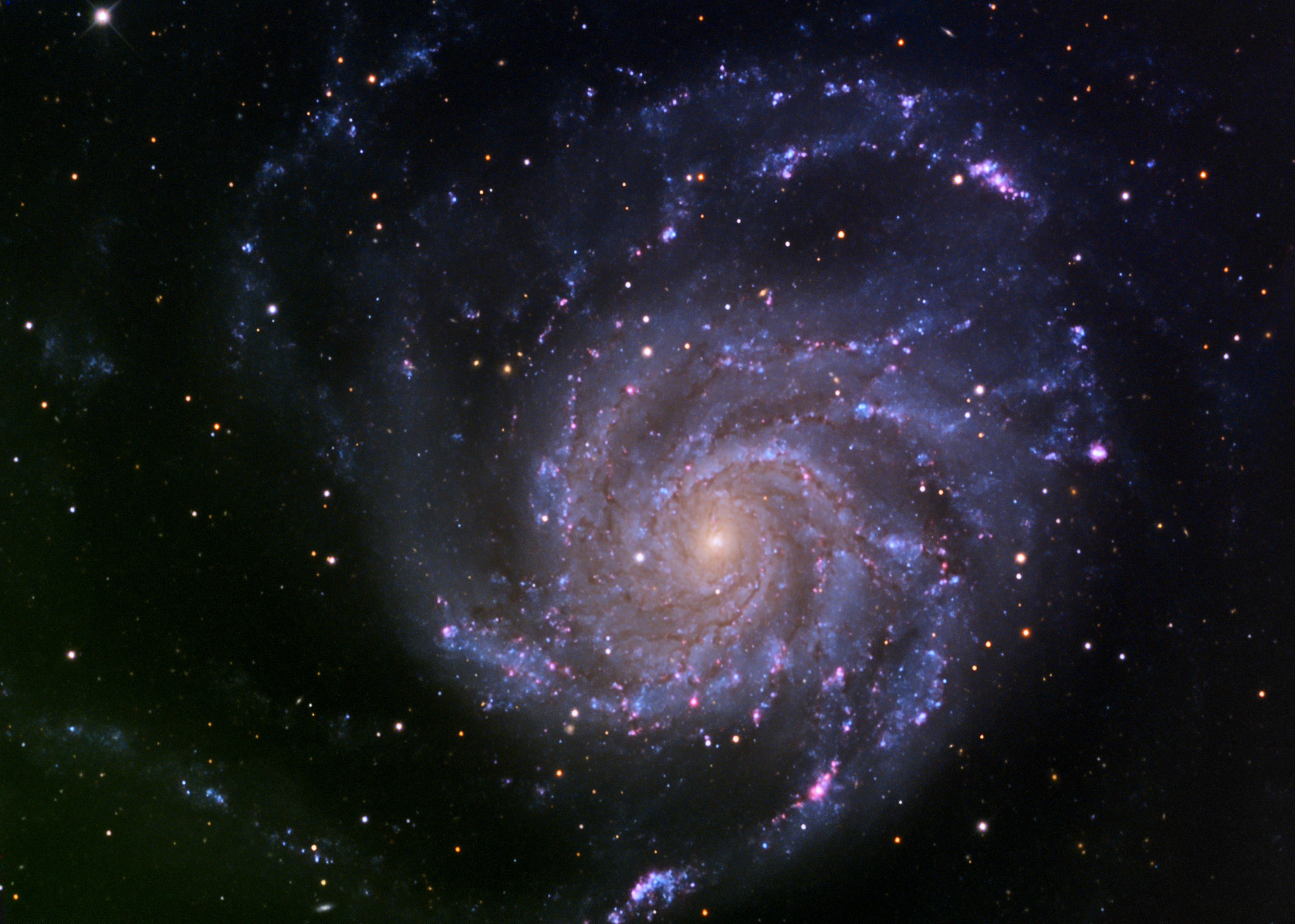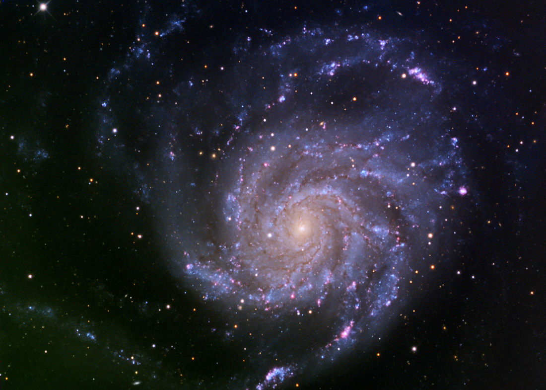 M101 Date: July 1, 2, 3, 4, 2010 (with additional Luminance from June 3, 2005) Camera: SBIG STL6303E Filters: AstroDon L,R,G,B (STL internal filter wheel) Camera control software: CCDSoft Guiding/adaptive optics: AO-L, internal guide chip Camera temperature: -10C (-20 2005 data) Image Acquisition Software: CCDAutopilot4 Telescope: RCOS 16 Carbon Tube, Aries optics, F9 Telescope control software: RCOS TCC, TheSky6 Mount: Paramount ME (MKS 4000) Subexposures: Luminance: 314 minutes, unbinned (14x900 sec 2010; 13 x 480 sec 2005) RGB: 165 minutes each, binned 2x2 Conditions: high humidity. Processing: CCDStack2; Photoshop CS4. |