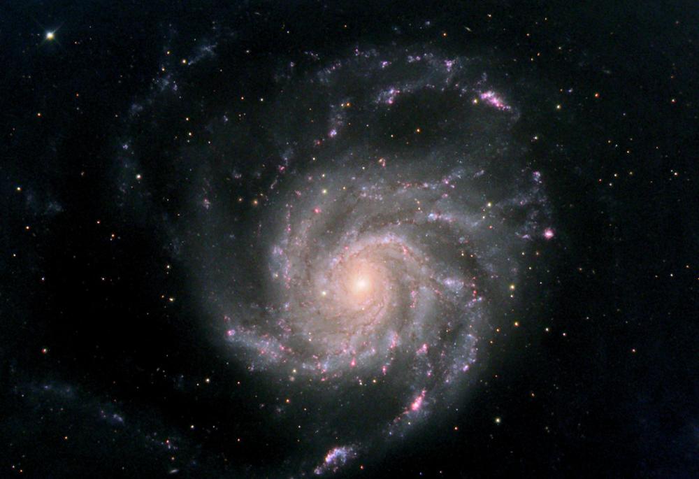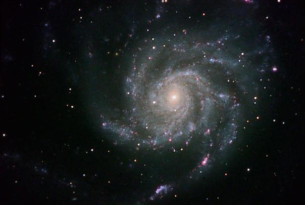 M101 Date: June 3, 2005 Camera: SBIG STL6303E Filters: AstroDon L,R,G,B (STL internal filter wheel) Camera control software: CCDSoft Focal reducer: None Guiding/adaptive optics: self-guided, internal guide chip Camera temperature: -20C Image Acquisition Software: CCDAutopilot2 for certain steps Telescope: RCOS 16 Carbon Tube, Aries optics, F9 Telescope control software: RCOS TCC, TheSky6 Mount: Paramount ME (MKS 4000) Subexposures: Luminance: 13 x 8 minute, binned 1x1 RGB: 7 x 3 minute, binned 2x2 Conditions: high humidity. Processing: CDSoft, CCDSharp (Luminance only), MiraAP, MaximDL, Registar, Sigma, Photoshop CS2. |