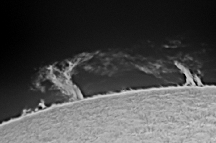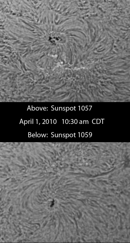 Date: April 1, 2010, 10:53am CDT Camera: Lumenera SKYnyx 2-0M Filters: Solar Spectrum 0.3A Ha/155mm Baader ERF Camera control software: Lucam Recorder Telescope: AP 155 EDF/ Baader Telecentric 4x before SS unit; AP 0.7x FR after SS unit. Telescope control software: TheSky6 Mount: AP1200GTO Subexposures: Best 3,000 of 5,000 frames of two different exposure streams to capture surface and prominence detail. Processing: Registax (multipoint alignment), Photoshop CS4. |