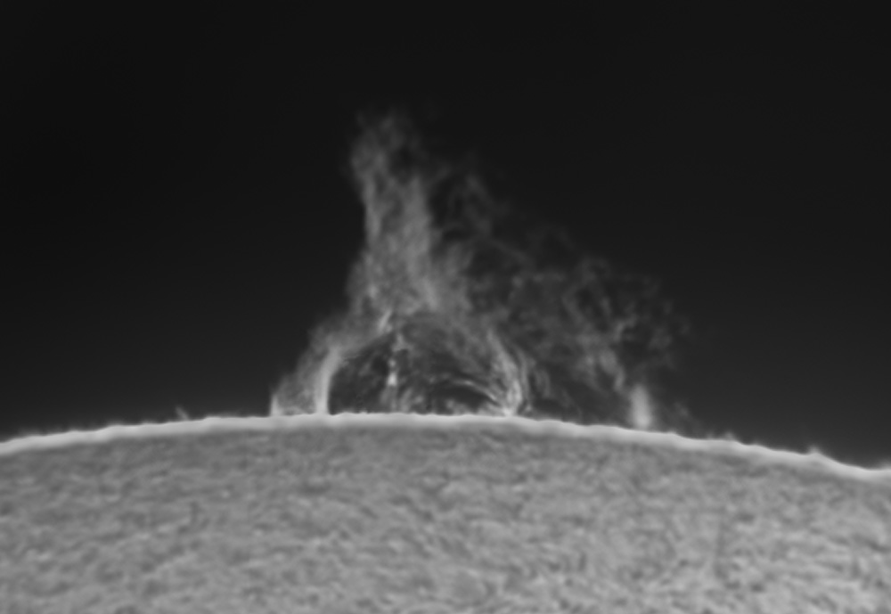 Date: April 3, 2010, 12:08 pm CDT. Camera: Lumenera SKYnyx 2-0M Filters: Solar Spectrum 0.3A Ha/155mm Baader ERF Camera control software: Lucam Recorder Telescope: AP 155 EDF/ Baader Telecentric 4x before SS unit; AP 0.7x FR after SS unit. Telescope control software: TheSky6 Mount: AP1200GTO Subexposures: Approximately 2500/4500 frames of two different exposure streams to capture surface and prominence detail. Processing: Registax (multipoint alignment), Photoshop CS4. |
